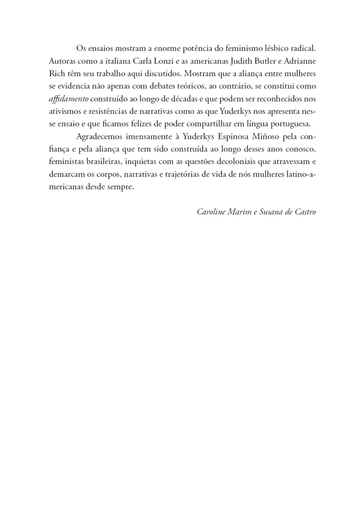 Os ensaios mostram a enorme potência do feminismo lésbico radical. Autoras como a italiana Carla Lonzi e as americanas Judith Butler e Adrianne Rich têm seu trabalho aqui discutidos. Mostram que a aliança entre mulheres se evidencia não apenas com debates teóricos, ao contrário, se constitui como affidamento construído ao longo de décadas e que podem ser reconhecidos nos ativismos e resistências de narrativas como as que Yuderkys nos apresenta nesse ensaio e que ficamos felizes de poder compartilhar em língua portuguesa.