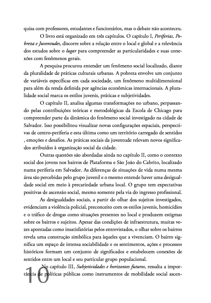 Esse livro compreende como uma periferia brasileira implica nas subjetividades juvenis. Os jovens são estudantes do Ensino Médio do Colégio Estadual Democrático Bertholdo Cirilo dos Reis, localizado no bairro São João do Cabrito, em Salvador/BA. As perspectivas de futuro e horizontes de realizações pessoais deles/as atravessam a busca por superação de privações via ingresso profissional. Escola e Trabalho constituem centralidades por melhores condições de vida.