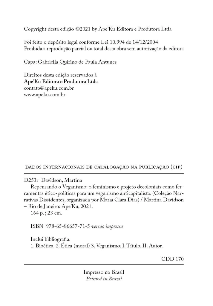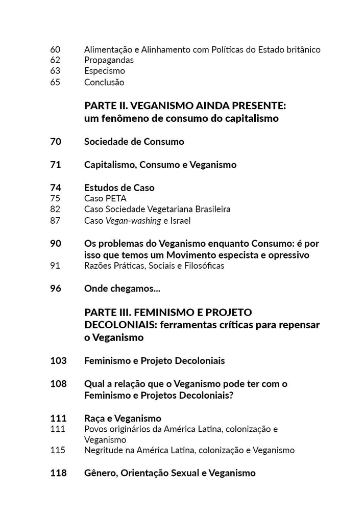 O Veganismo enquanto dieta foi definido em 1944, no Reino Unido, por Donald Watson. Tal conceito teve origem a partir de um grupo de pessoas que compunha a Vegan Society (Sociedade Vegana) do Reino Unido, a qual publicava newsletters sobre o tema de forma constante. Assim, esta obra realiza uma contextualização e análise históricas sobre a construção do Veganismo europeu, de forma a entendê-lo enquanto fenômeno e conceito que, desde sua forjadura, excluiu determinadas identidades políticas e participantes, apresentando-se como fruto de particularidades econômicas e políticas da época. A partir da análise das revistas da Sociedade Vegana de 1944 a 1954, em associação com dados sobre a política de guerra do Estado britânico acerca do racionamento de alimentos e políticas ao redor do mesmo, busca-se demonstrar como o Veganismo de origem europeia ainda se encontra em vigência fenomenológica e conceitual no mundo, manifestando-se como sociedade de consumo e estética. Dessa forma, o Veganismo assume o papel de um braço funcional do Capitalismo e possui as mesmas marcas presentes desde 1944. Através do mapeamento dos processos de violência e opressão que forjaram a América Latina, por intermédio das perspectivas feministas e do projeto decoloniais, esta obra traz críticas ao Veganismo, sua forjadura, fenômeno e conceito. Entender os veganismos enquanto projetos decoloniais e antiopressão é entender que eles não podem operar dentro de uma lógica capitalista, assim como é necessário que exista uma base ética e política para sua coerência.